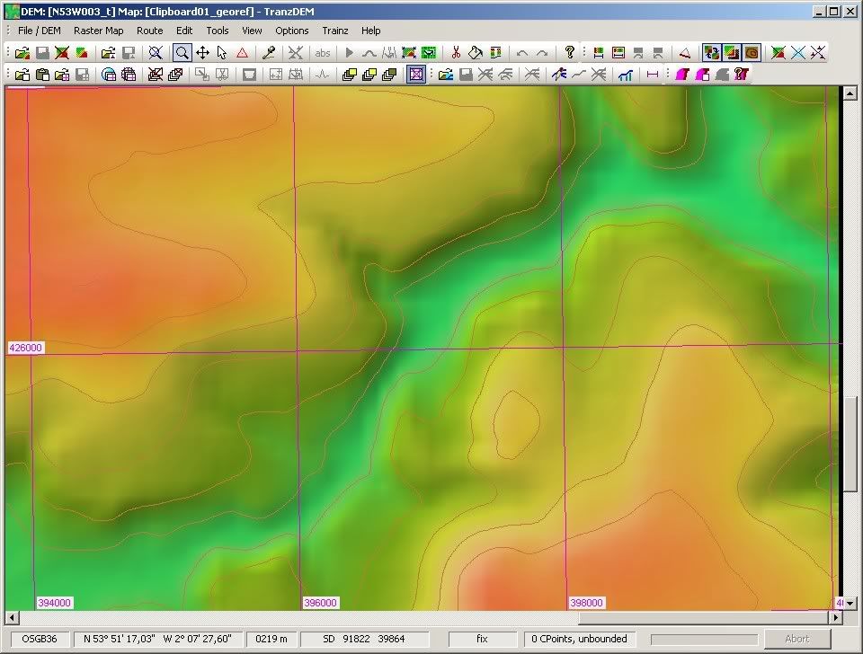 TransDEM supports O/S Land-Form Panorama DEMs in ESRI grid format from Version 2.1. Before, TransDEM could only read this format if the coordinates were geographic (lat/long). I extended the ESRI grid reader to also support projected coordinates. Since the coordinate system is not part of the meta data information in the file, it must be specified in TransDEM explicitly. In this case coordinates are O/S grid (OSGB36).